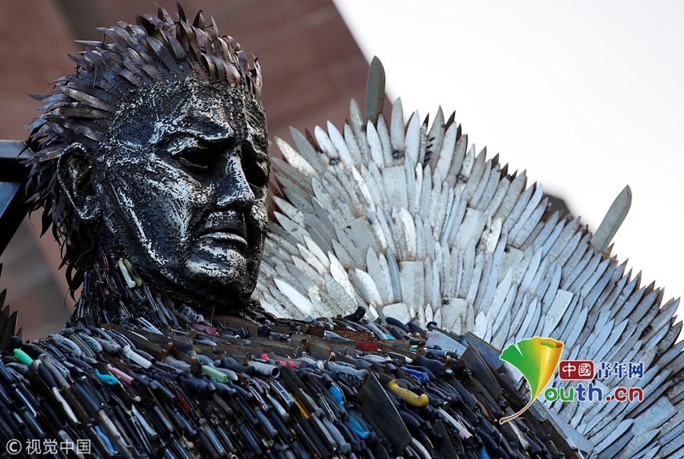 當(dāng)?shù)貢r間2018年11月29日,英國利物浦,藝術(shù)家阿爾菲·布拉德利在圣公會教堂外用沒收的10萬多把刀具制作了一尊名為“刀之天使”的塑像。