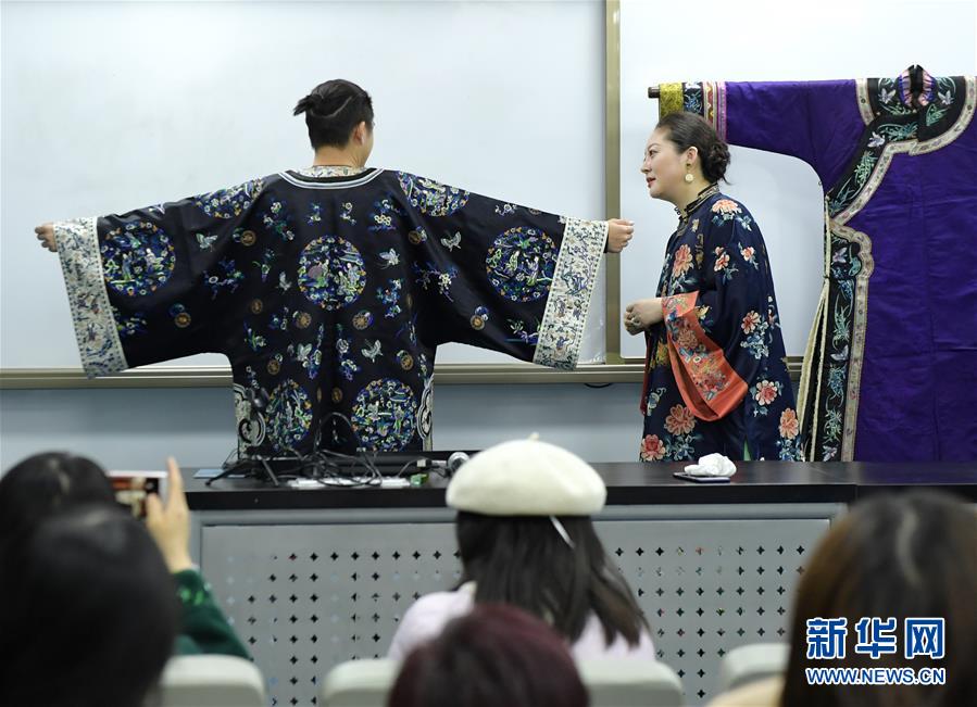 11月30日,在北京服裝學(xué)院,在畢紅(右)的邀請(qǐng)下,一名大學(xué)生試穿清代團(tuán)花刺繡服裝。