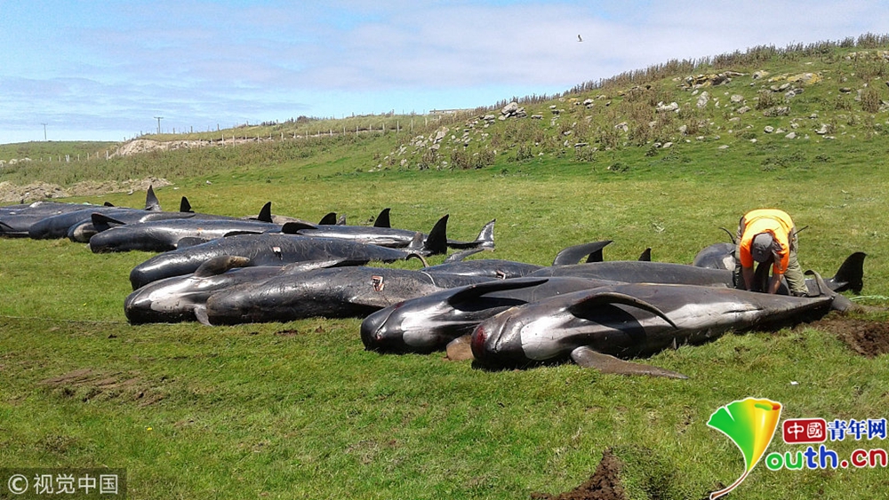 多頭巨鯨新西蘭海岸擱淺死亡 沿海海水染成紅色