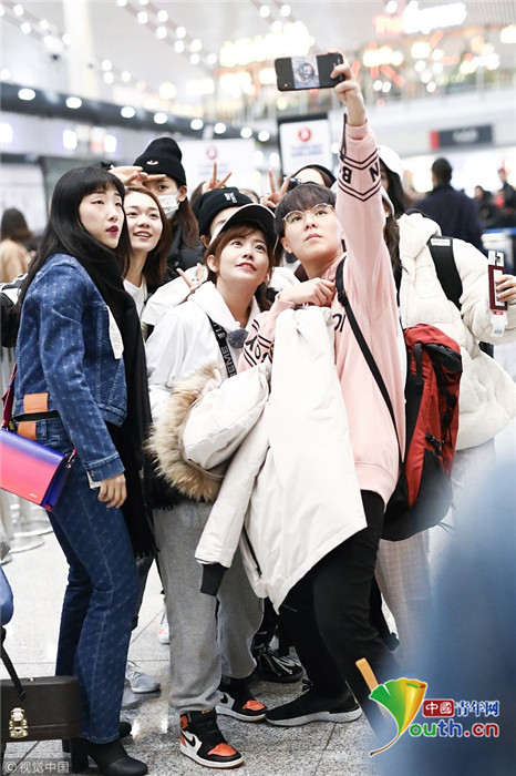 2018年12月3日,北京,“火箭少女101”全體成員現(xiàn)身機(jī)場前往國外錄制團(tuán)總綜。其中孟美岐戴著墨鏡,一身全黑運(yùn)動(dòng)裝扮,大步流星氣場超強(qiáng),楊蕓晴、yamy、楊超越等成員緊隨其后,大家還一起在機(jī)場玩起自拍,好不歡樂。