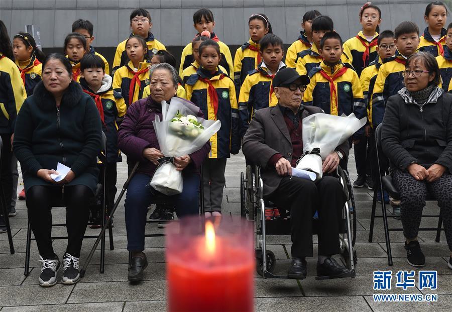 12月3日,南京大屠殺幸存者余昌祥(前排左三)、石秀英(前排左二)在家祭活動現(xiàn)場。 當(dāng)日,在第五個南京大屠殺死難者國家公祭日到來之際,南京大屠殺死難者遺屬家祭活動在侵華日軍南京大屠殺遇難同胞紀(jì)念館正式啟動。首批前來開展家祭活動的南京大屠殺幸存者余昌祥、石秀英老人分別率家屬在紀(jì)念館內(nèi)的死難者名單墻前獻花、敬香、跪拜,并誦讀家信,表達對親人的哀思。 新華社記者 孫參 攝