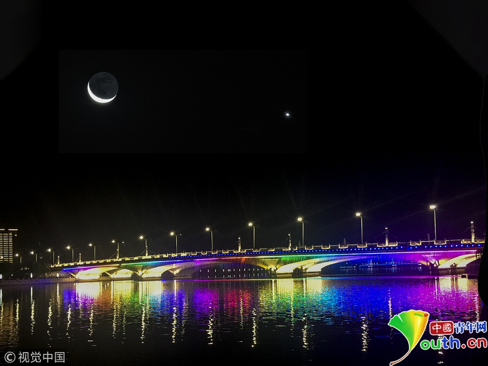 北京,天宇上演“金星合月”,清晨5點時,東南方低空出現(xiàn)一顆明亮的金星和一彎窄月近距離相依相伴的美麗畫面。