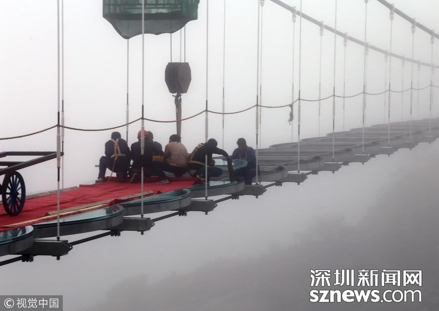 深圳新聞網(wǎng)訊 2018年12月3日,在浙江玉環(huán)市上棧頭玻璃吊橋建設(shè)工地上,工人們正在北端橋頭鋪設(shè)橋面4厘米厚的玻璃,預(yù)計46個箱梁的玻璃全部鋪設(shè)完成需到5日,然后再進入安裝兩側(cè)護欄和拉攀抗風(fēng)拉索,吊橋工程竣工定于23日,準備在2019年元旦試運行。