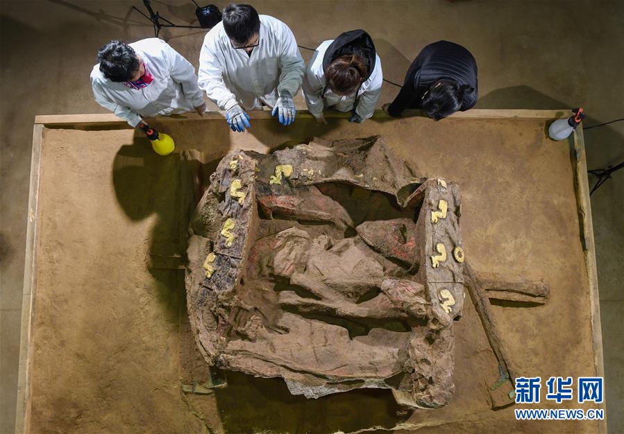 在位于河北行唐的考古實驗室內(nèi),外表裝飾奢華的車廂(俯視)展露“真容”(12月4日攝)。新華社記者 李賀 攝