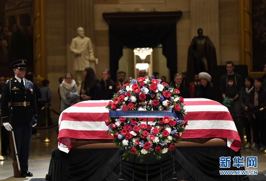 美國前總統(tǒng)老布什的遺體3日下午運抵首都華盛頓,安放在國會大廈圓頂大廳,接受吊唁。