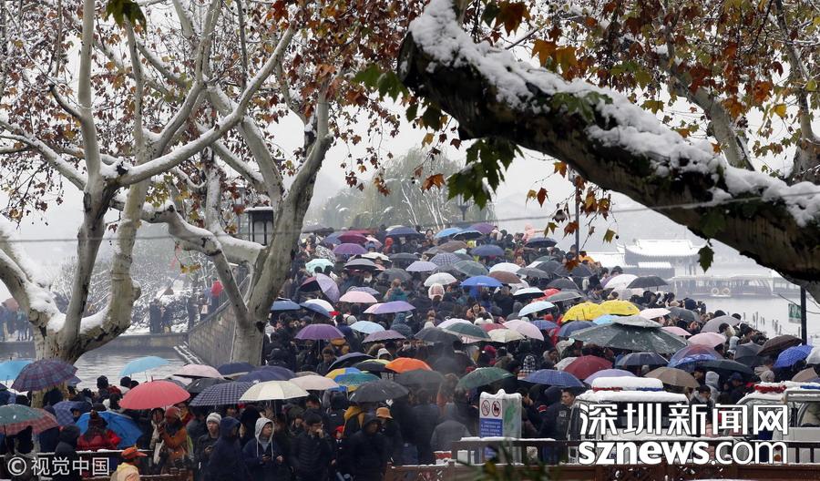 深圳新聞網(wǎng)訊 2018年12月8日,杭州,當(dāng)日市區(qū)普降大雪,市民和游客扎堆涌入西湖景區(qū),拍攝最美雪景照片以及為自己留影。每次杭州一下雪,斷橋便成為眾多游客欣賞雪景、拍攝雪景的地方,大家都想看看“斷橋殘雪”。游客們扎堆涌入斷橋后,人山人海,讓現(xiàn)場堪比春運(yùn)場景。因?yàn)槿颂啵┓e不起來,斷橋看不到殘雪。