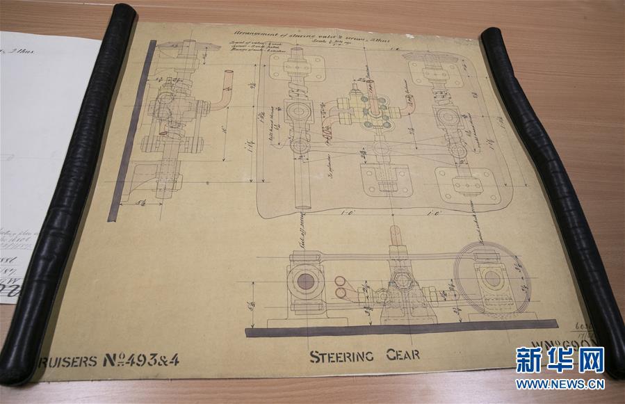 這是11月2日在英國紐卡斯?fàn)柕奶┒鳌枡n案館拍攝的致遠(yuǎn)艦設(shè)計(jì)圖紙。 新華社記者日前在紐卡斯?fàn)柼┒鳌枡n案館查找北洋海軍史料時(shí)發(fā)現(xiàn)一套七張、檔案名為“中國巡洋艦舵機(jī)設(shè)計(jì)圖”的原始圖紙。塵封百年,甲午海戰(zhàn)中抗擊日艦后沉沒的清北洋海軍致遠(yuǎn)艦部分原廠設(shè)計(jì)圖紙?jiān)谄浣ㄔ斓亍~卡斯?fàn)柺械囊患覚n案館首次被發(fā)現(xiàn),為打撈那段悲壯的歷史提供了重要參考。 新華社記者 韓巖 攝