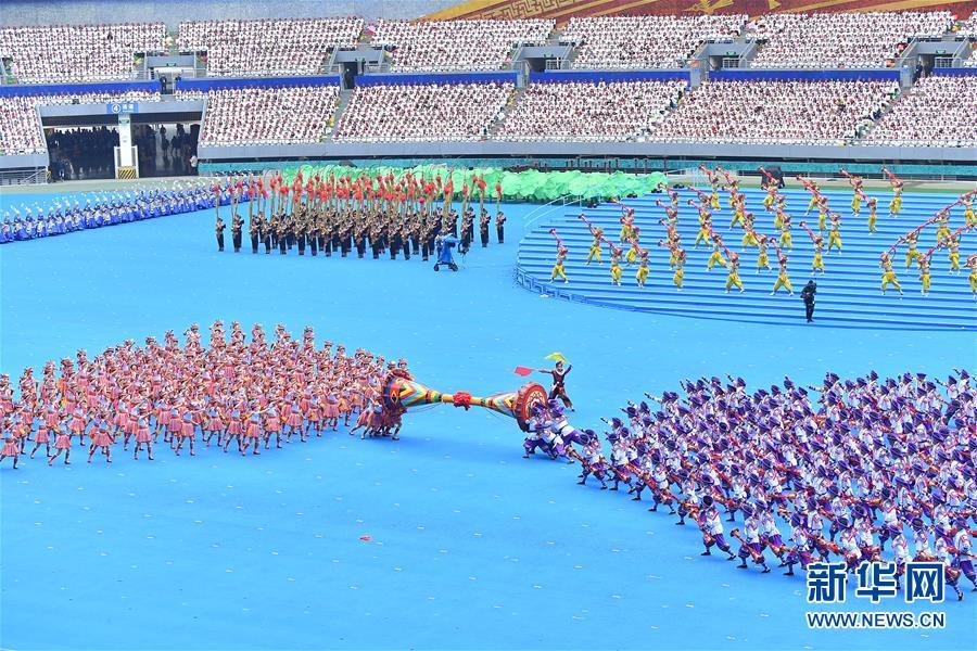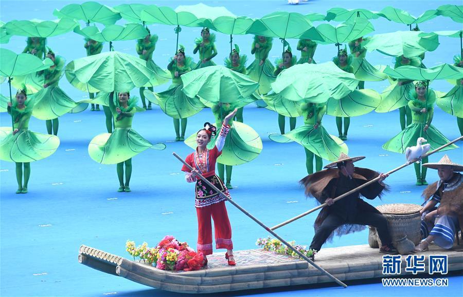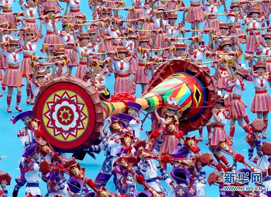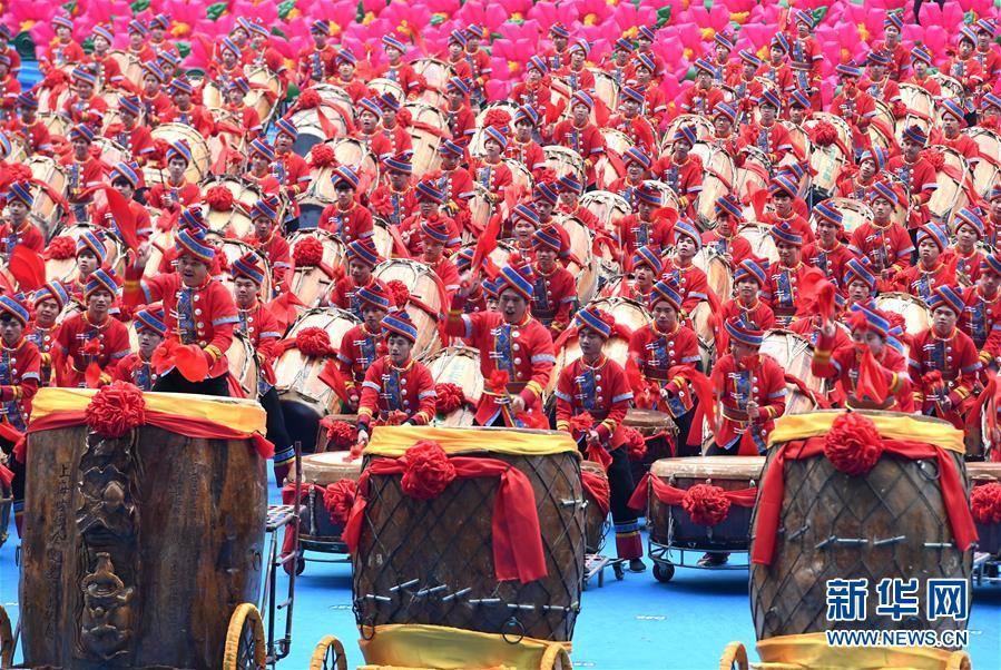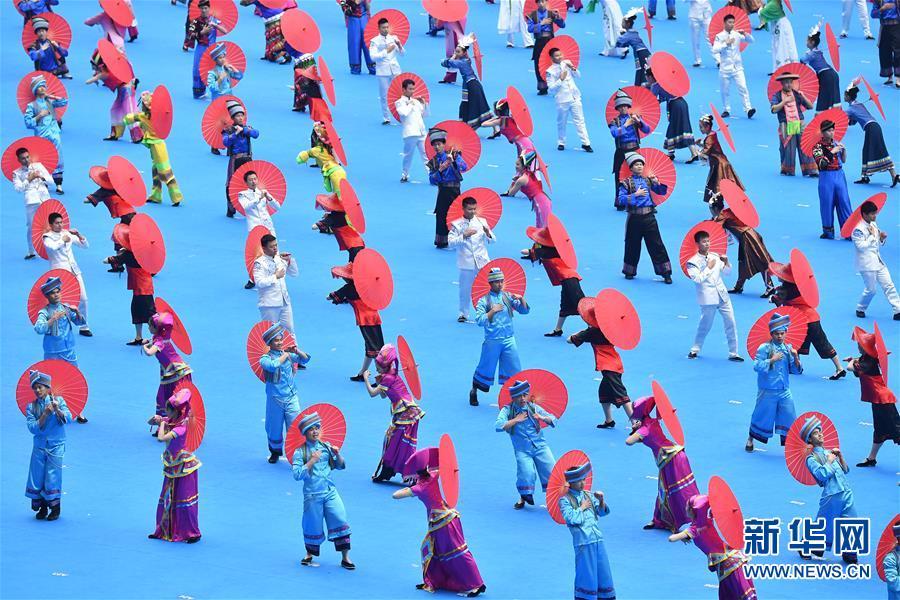 12月10日,廣西壯族自治區(qū)成立60周年慶祝大會在廣西體育中心隆重舉行。這是慶祝大會上的群眾文藝表演。 新華社記者 申宏 攝