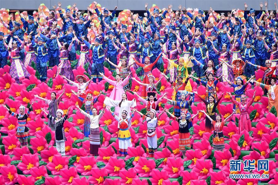 12月10日,廣西壯族自治區(qū)成立60周年慶祝大會(huì)在廣西體育中心隆重舉行。這是慶祝大會(huì)上的群眾文藝表演。 新華社記者 李鑫 攝