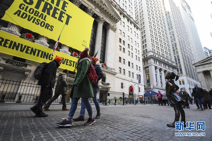 12月10日,在美國(guó)紐約,人們從紐約證券交易所前的“無畏女孩”銅像旁走過。 新華社記者 王迎 攝