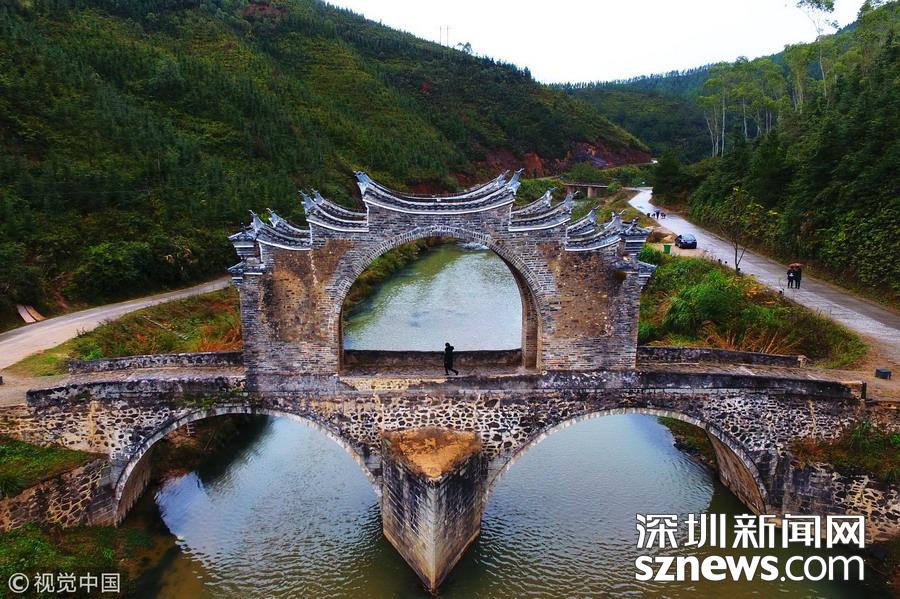 深圳新聞網2018年12月12日訊 太平橋位于江西省龍南縣楊村鎮(zhèn)街道北面太平江上,為兩孔三墩、四拱雙層重疊組合石拱橋。全長50米,造型奇特,上有四通涼亭,以方便行人覽勝和憩息。始建于明正德年間,為全國重點保護文物保護單位。 劉占昆 (江西分社)/中新社/視覺中國