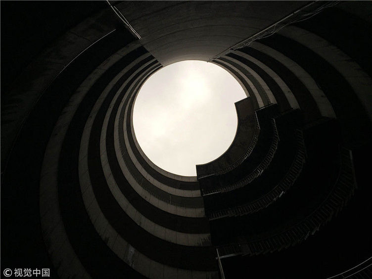 2018年12月6日,重慶江北紅旗河溝汽車站內(nèi),有一棟獨(dú)特的八層圓環(huán)狀建筑,底層每天有不少進(jìn)出站的客車通行。據(jù)悉,這棟樓建于1990年,曾經(jīng)是車站旅館,如今一、二兩層用于車站辦公,其余樓層已廢棄。為確保安全,三層以上已經(jīng)被封鎖。圖為公交車穿過8層空心圓筒樓。徐勇/視覺中國(guó)