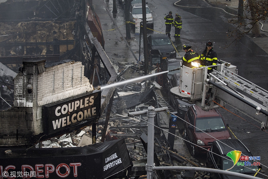 當(dāng)?shù)貢r(shí)間2018年12月13日,美國紐約,在紐約皇后區(qū)皇后大道,一場(chǎng)大火吞噬了六家商鋪,消防隊(duì)員正在努力撲滅火災(zāi)余燼。十幾人受傷,包括6名消防員。起火原因仍在調(diào)查中。圖片作者:Drew Angerer