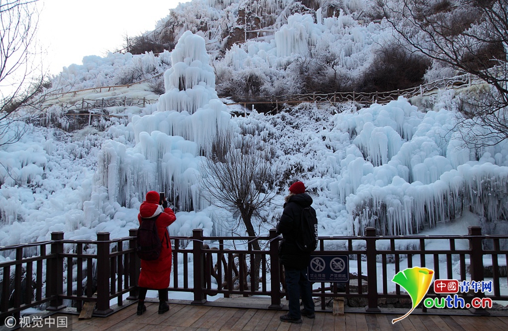 市民在拍攝冰瀑景觀。