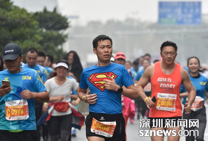 2018年12月16日,深圳國際馬拉松位于后海的折返點,一名身著超人標(biāo)志短袖選手正在向終點沖刺。