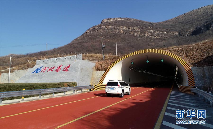 12月16日,一輛汽車行駛在京秦高速公路二期工程河北玉田境內的鳳凰頂隧道路段(無人機拍攝)。