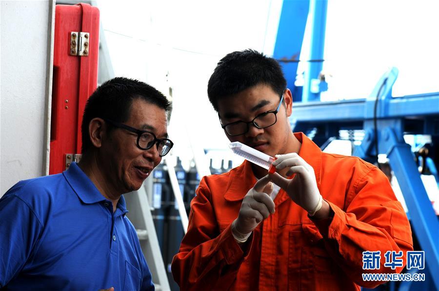 “彩虹魚”科考團(tuán)隊(duì)海上總指揮崔維成(左)和考察隊(duì)員耿道(右)在觀察捕獲的深淵生物(12月12日攝)。