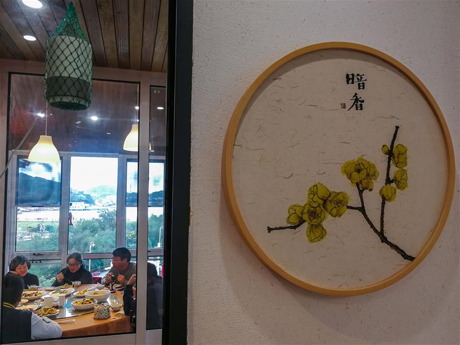 12月15日,客人在朱家尖烏石塘“漁夫客棧”民宿包廂內(nèi)用餐,該民宿有海景房7間,餐飲包廂8個。 新華社記者 徐昱 攝