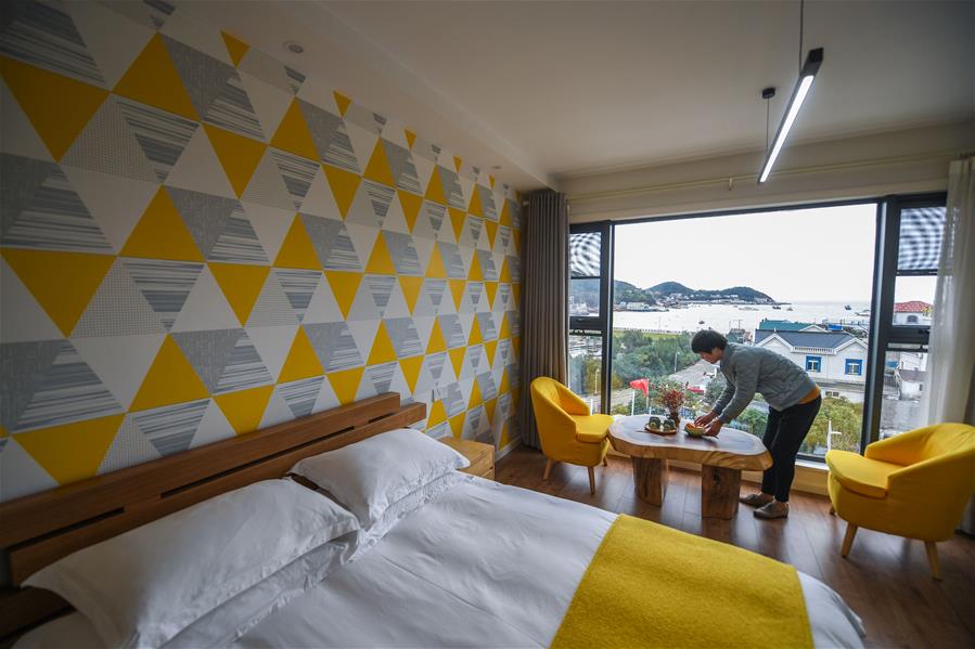 12月16日,“迷嶼海”民宿女主人張馨予在民宿大堂忙碌。該民宿臨海而建,環(huán)境優(yōu)美,吸引很多游客前來休閑住宿。 新華社記者 徐昱 攝