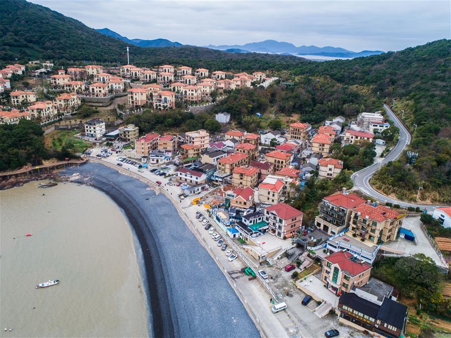 空中俯瞰朱家尖烏石塘的臨海民宿(12月15日無人機拍攝)。新華社記者 徐昱 攝