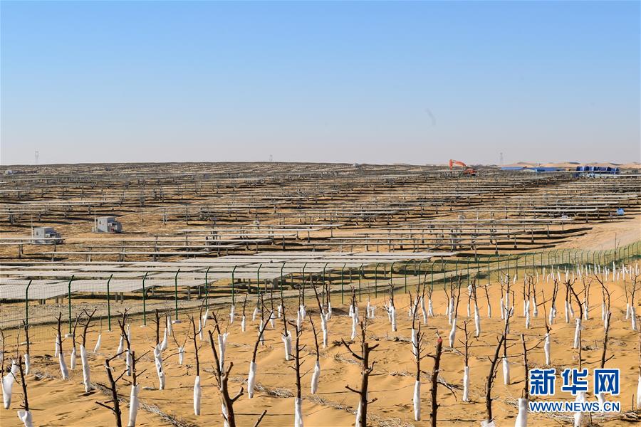 位于庫布其沙漠腹地的達拉特光伏發(fā)電應用領跑基地一期500兆瓦項目(12月13日攝)。