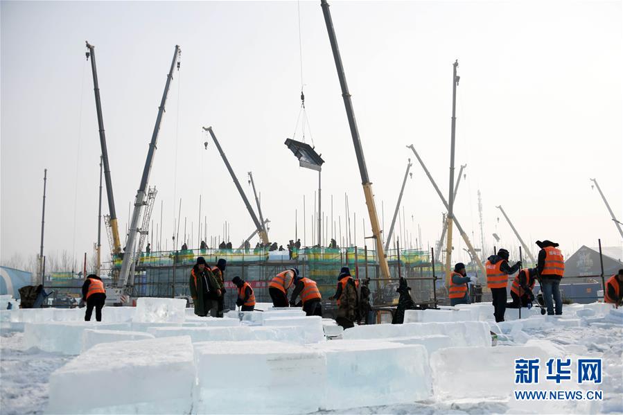 12月13日,工人在第二十屆哈爾濱冰雪大世界園區(qū)施工。新華社記者 王建威 攝