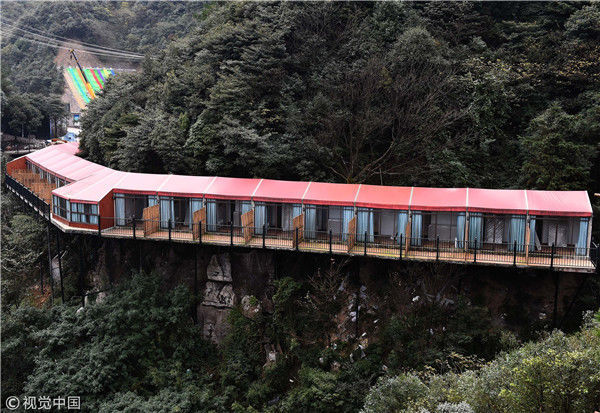2017年11月16日,重慶萬盛一景區(qū)內(nèi)的臨崖酒店依山而建,色彩絢麗如山間彩虹。據(jù)介紹,該酒店位于當(dāng)?shù)貖W陶紀(jì)景區(qū)內(nèi),酒店順著山形而建盤旋在山間,特別顯眼。 周毅(重慶分社)/中新社/視覺中國(guó)