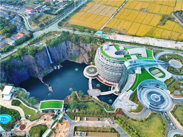 “深坑酒店”酒店主體建筑主要分為三部分:地上部分、坑下至水面部分、水下部分。其中,坑下至水面部分以建筑主樓為主;水下部分是酒店的特色客房區(qū)和特色水下餐廳。地面僅有2層,坑下水上14層,水下2層,地面兩層主要包括觀星臺(tái)、大堂吧、宴會(huì)廳、會(huì)議室等等,大堂以“地心奇遇”為主題,墻面立體,呈古銅色,與礦坑巖層相呼應(yīng)。