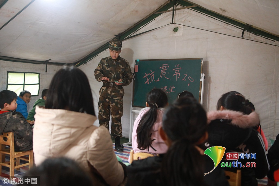 2018年12月18日,四川宜賓。武警宜賓支隊政治工作處宣傳保衛(wèi)股股長朵祝偉為周家鎮(zhèn)新塘安置點的“帳篷學?!钡膶W生上抗震常識課。圖片作者:謝江、劉崇達/視覺中國