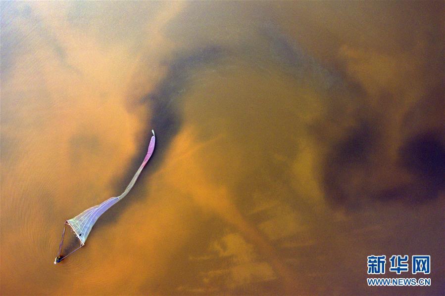 2018年7月6日,捕撈人員在山西運城鹽湖內捕撈鹽水蟲。 大地之色,俯仰之間;壯美山河,是我的祖國。2018年,新華社記者操縱無人機“飛閱”華夏大地,在最美的時節(jié),定格下她的色彩斑斕。 新華社記者 曹陽 攝