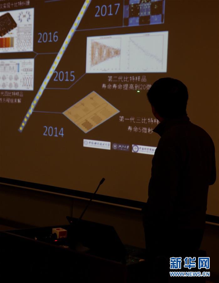 2017年5月3日,中國科學(xué)技術(shù)大學(xué)潘建偉院士在上海宣布,我國科研團(tuán)隊成功構(gòu)建的光量子計算機(jī),首次演示了超越早期經(jīng)典計算機(jī)的量子計算能力。這是潘建偉院士在介紹“超導(dǎo)量子計算機(jī)路線圖”。 新華社記者 金立旺攝