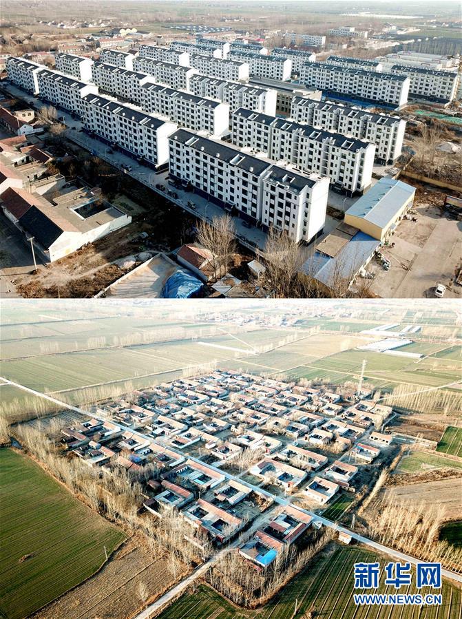 上圖為12月20日拍攝的青城鎮(zhèn)青平社區(qū);下圖為12月20日拍攝的搬遷完畢的青城鎮(zhèn)菜園村(無人機航拍,拼版照片)。