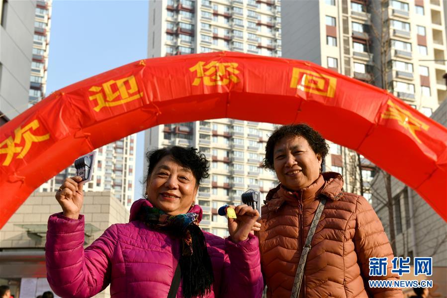 12月20日,在濟南市槐蔭區(qū)和諧佳苑小區(qū),回遷居民邵虹(左)和賈桂芝展示領到的回遷房鑰匙。 當日,濟南市槐蔭區(qū)經十一路棚戶區(qū)改造項目——和諧佳苑小區(qū)正式交付居民回遷安居。作為濟南市槐蔭區(qū)頭號民生工程,本項目共17棟安置樓,實現(xiàn)棚戶區(qū)居民“出棚進樓”,改善安居環(huán)境。 新華社記者 郭緒雷 攝