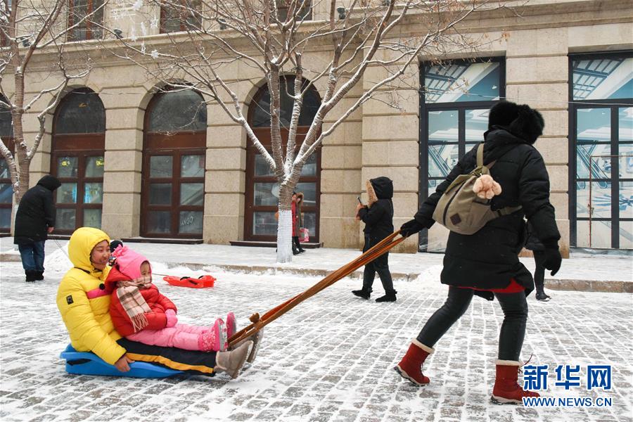 12月21日,游客在哈爾濱中央大街玩耍。當(dāng)日,“冰城”哈爾濱迎來(lái)降雪天氣,整個(gè)城市變得銀裝素裹。新華社記者韓宇攝