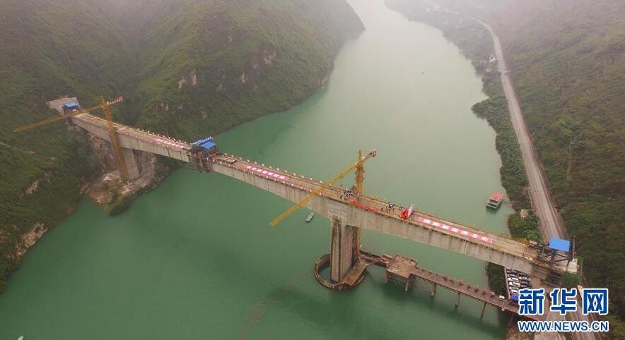在重慶涪陵拍攝的渝懷鐵路涪秀二線重點工程——烏江右線大橋(10月23日無人機(jī)拍攝)。10月23日,由中鐵四局承建的渝懷鐵路涪秀二線重點工程——烏江右線大橋主跨成功合龍,標(biāo)志著大橋主體工程全部順利結(jié)束。烏江右線大橋項目全程460.1米,主跨192米,跨越烏江和319國道。在兩年多的建設(shè)過程中,施工人員攻克了“不等高墩”“不對稱邊跨”“邊跨入隧”等多個技術(shù)難題。新華社記者王全超攝