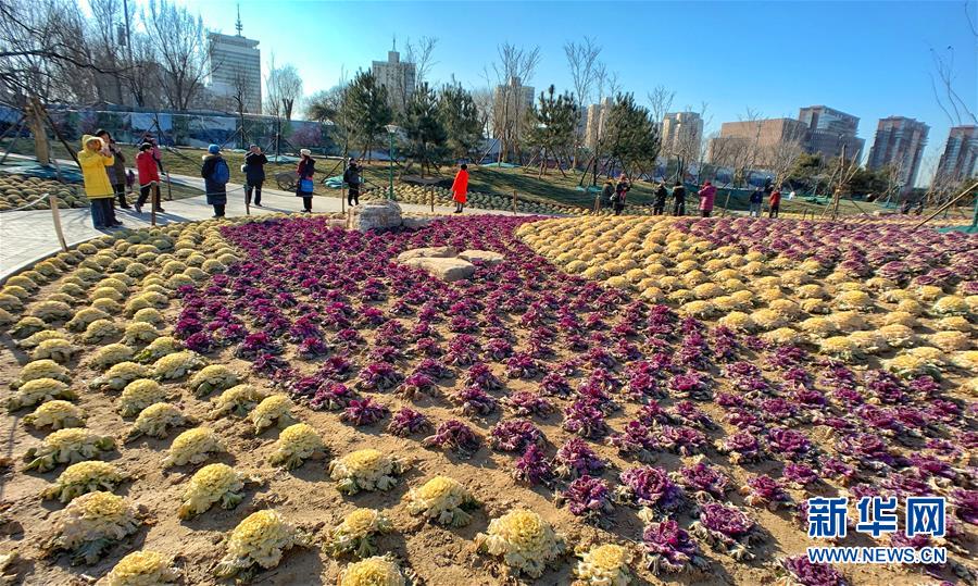 12月24日,游人在北京玉淵潭公園觀賞甘藍。 日前,北京市玉淵潭公園移栽的三萬多棵紫色和黃色羽衣甘藍盛開,為冬季公園增添了色彩。 新華社記者李欣攝