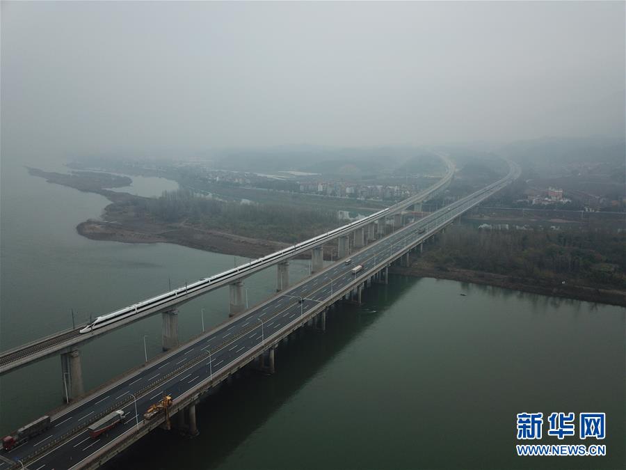 ↑12月25日,D9551次首發(fā)列車駛過富春江特大橋(無人機(jī)拍攝)。新華社記者 邢廣利 攝