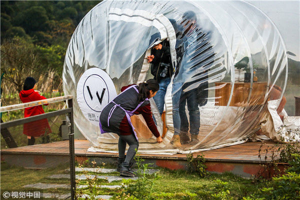 2018年12月17日,廣西桂林,陽朔縣遇龍河畔。主人引領(lǐng)游客走進泡泡屋。