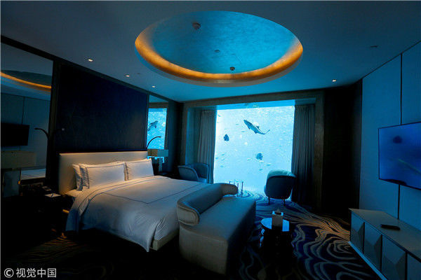 2018年4月25日,海南三亞,亞特蘭蒂斯酒店的海王星水下套房,魚在窗外游泳。