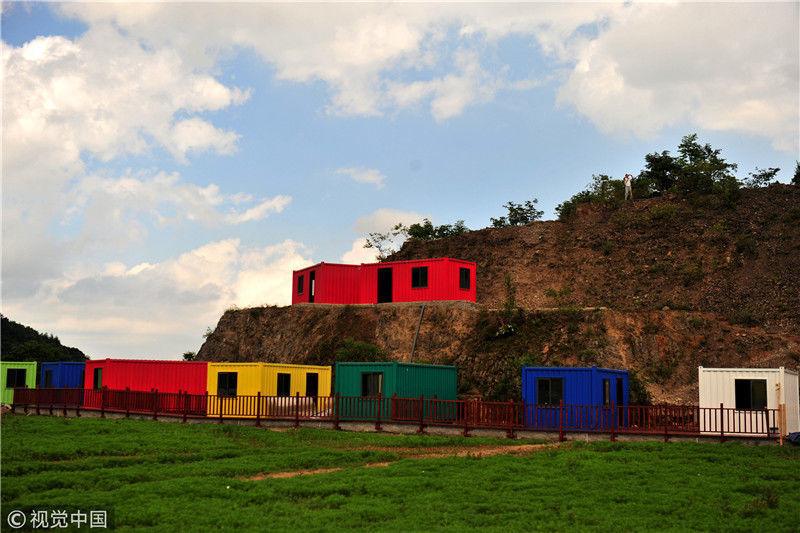 2018年6月9日,湖北省宜昌市夷陵區(qū)樟村坪鎮(zhèn)羊角山村“云上西寨”康養(yǎng)綠地正在建設(shè)的“集裝箱”民俗項目區(qū)風(fēng)景。張國榮/視覺中國