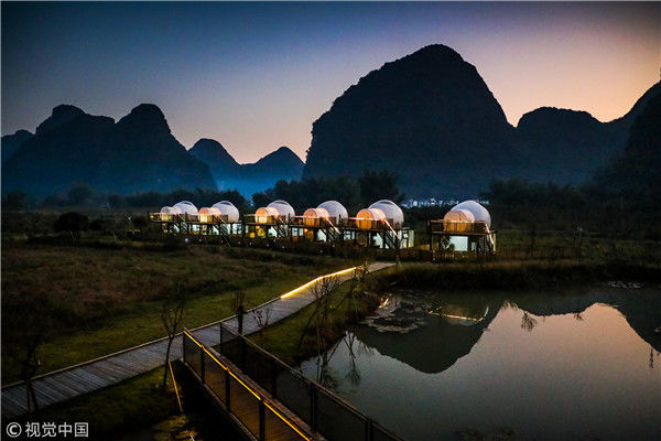 2018年12月17日,廣西桂林,陽朔縣遇龍河畔。黃昏時分,游客站在觀景臺觀賞泡泡屋及周邊景觀。