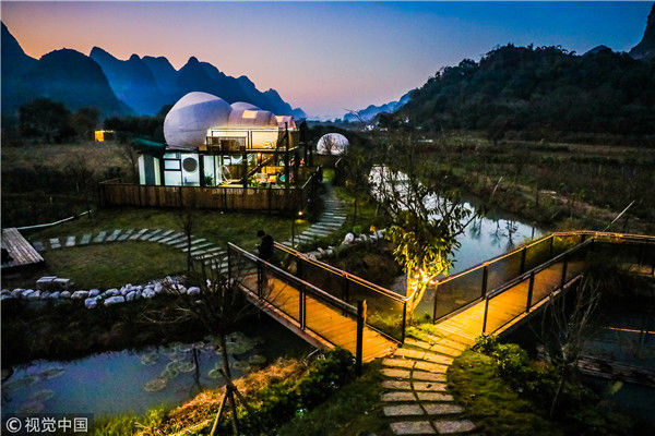 最近這幾年,中國的民宿風(fēng)越刮越猛,各地精品民宿紛紛如雨后春筍一樣冒出了,而且他們用其更獨特的設(shè)計感吸引著人們的目光。其實對比星級酒店,民宿最大的優(yōu)勢,就是設(shè)計風(fēng)格更獨特,更具藝術(shù)感,也更符合人們的審美要求,同時又能做到比星級酒店更舒適,更適合度假,所以大家現(xiàn)在出行都更熱衷于選擇民宿。圖為2018年12月18日,廣西桂林,陽朔縣遇龍河畔。晨光中的泡泡屋。棋簿紫/視覺中國