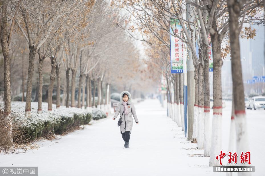 山東濱州發(fā)布道路結(jié)冰黃色預(yù)警信號(hào)市區(qū)出現(xiàn)較明顯降雪,路表溫度低于0℃。圖片來(lái)源:視覺中國(guó)