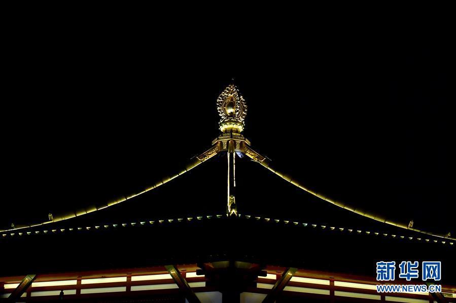 在古都河南洛陽(yáng)的夜色中,隋唐洛陽(yáng)城國(guó)家遺址公園內(nèi)的明堂和天堂兩棟古建筑格外閃耀。 新華社記者馮大鵬 攝