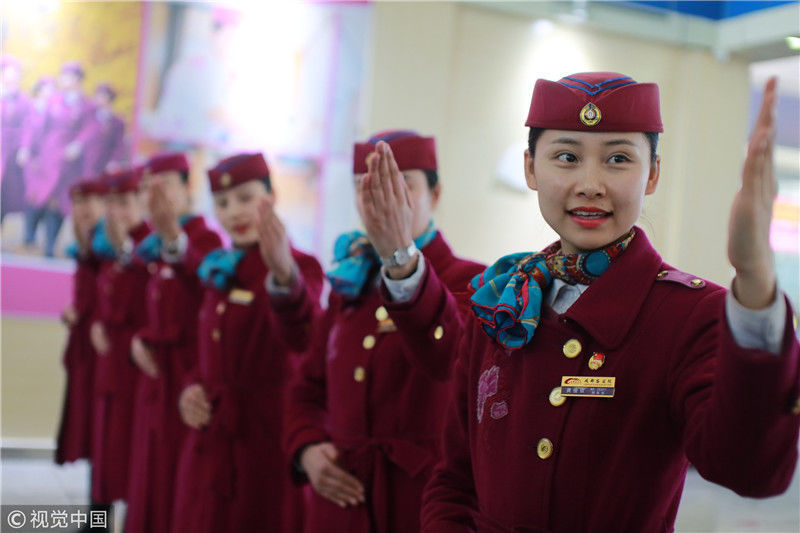 2018年12月27日,四川成都,為備戰(zhàn)即將開通的成雅鐵路,中國鐵路成都局集團(tuán)有限公司成都客運(yùn)段動(dòng)車二隊(duì)對(duì)成雅動(dòng)車的乘務(wù)人員進(jìn)行理論、形體、服務(wù)禮儀等內(nèi)容的培訓(xùn)。