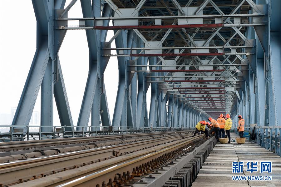線路工們在南京長江大橋鐵路橋進行木枕改道作業(yè)(12月27日攝)。