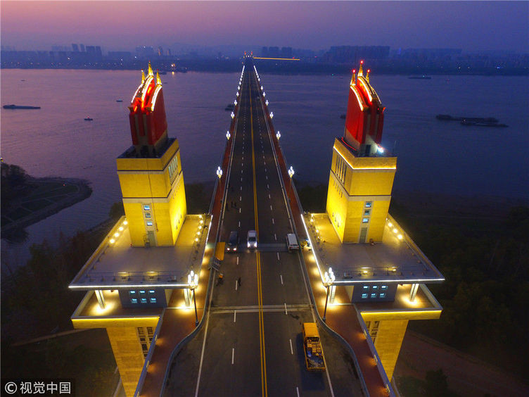 2018年12月13日,江蘇南京,“一橋飛架南北,天塹變通途。”作為我國第一座自行設(shè)計和建造的雙層鐵路、公路兩用橋,南京長江大橋在我國橋梁史上的重要地位不言而喻。從1968年建成后的48年間,它就如同一條巨龍,始終在長江上默默守護(hù)著人來車往。南京長江大橋上層是公路橋,下層為雙軌復(fù)線鐵路橋,連接津浦鐵路與滬寧鐵路干線,是我國南北交通要津和命脈。近年來,由于南京長江大橋公路橋的實際通行荷載遠(yuǎn)超原先設(shè)計標(biāo)準(zhǔn),不僅橋面上擁堵?,F(xiàn),橋梁本身的種種“病害”也日益加深。圖為2018年12月13日,夜幕降臨,南京長江大橋歸位后的玉蘭花燈重新點亮。大橋玉蘭花燈柱共有299根,每根燈柱上有5盞玉蘭花燈,1大4小,一共1495盞。方東旭/視覺中國