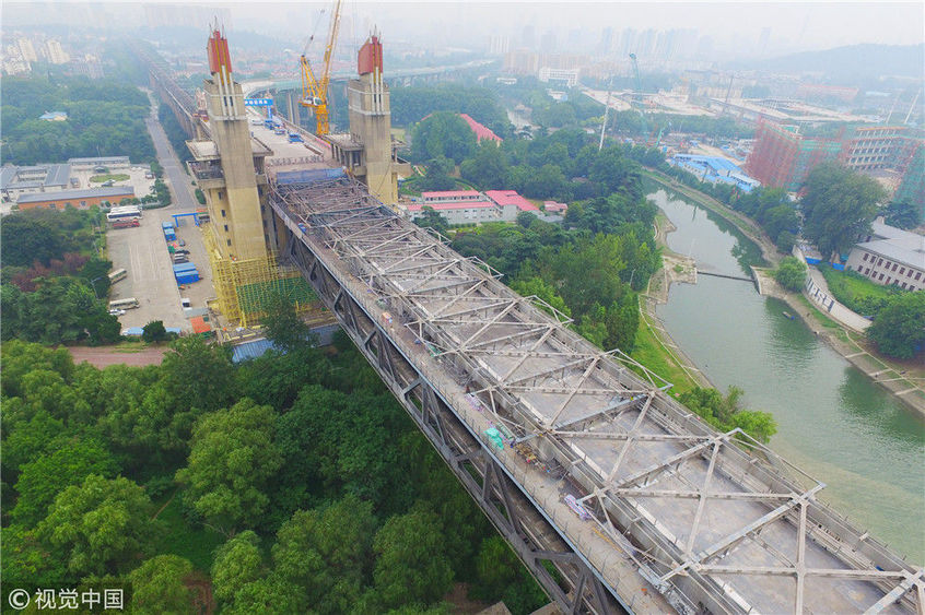 2017年9月19日,南京長江大橋正橋的混凝土面板已經全部拆除,僅剩交錯縱橫的鋼桁架橫跨在長江之上,從高空俯瞰猶如一條“鋼鐵巨龍”。