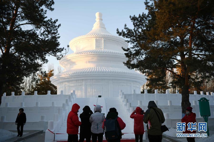 12月29日,在太陽島雪博會園區(qū),游客在雪雕作品前拍照。 當(dāng)日,第31屆哈爾濱太陽島國際雪雕藝術(shù)博覽會正式開園。本屆太陽島雪博會以“歡樂雪博會·夢幻雪域游”為主題,占地90萬平方米,分為五大景區(qū)。 新華社記者 王建威 攝