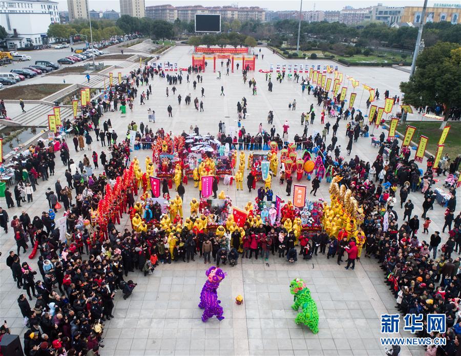 1月1日,演員在展演活動上進(jìn)行舞龍舞獅等非遺傳統(tǒng)文化表演(無人機(jī)拍攝)。2019年元旦,浙江省桐鄉(xiāng)市濮院鎮(zhèn)舉辦新年“非遺文化藝術(shù)節(jié)”活動,濮院鎮(zhèn)下屬多個(gè)鄉(xiāng)村的傳統(tǒng)美食制作、手工藝品、非遺文化表演等鄉(xiāng)村特色非遺項(xiàng)目在濮院鎮(zhèn)中心廣場進(jìn)行集中展示展演。新華社記者 徐昱 攝